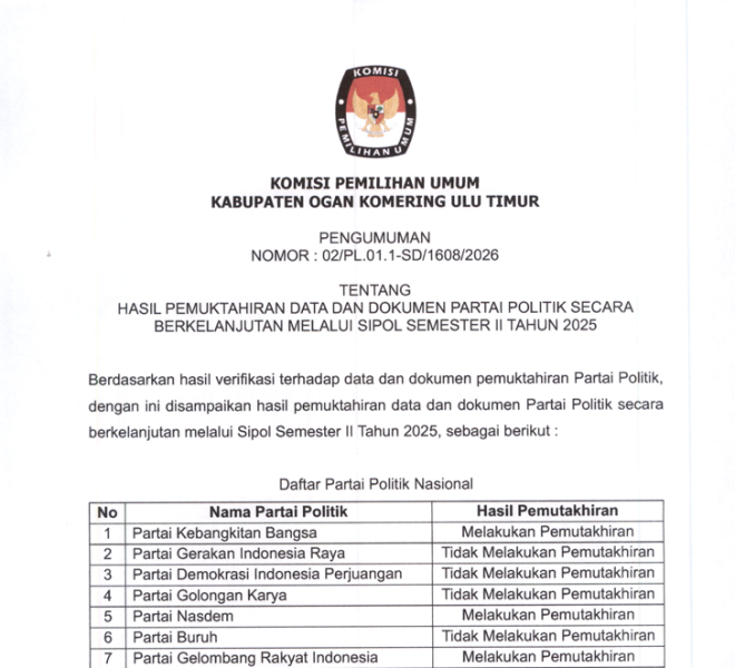 Pengumuman Hasil Pemutakhiran Data dan Dokumen Partai Politik Secara Berkelanjutan Melalui Sipol Semester II Tahun 2025