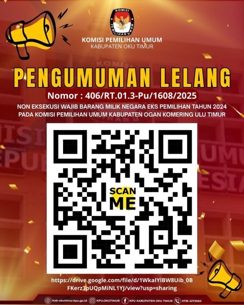 Lelang akan dilaksanakan pada hari Kamis, 2 Oktober 2025. Untuk detail barang, syarat dan ketentuan lelang kunjungi website resmi Komisi Pemilihan Umum Kabupaten Ogan Komering Ulu Timur silahkan Scan Barcode yang tertera diatas atau dapat diunduh DISINI