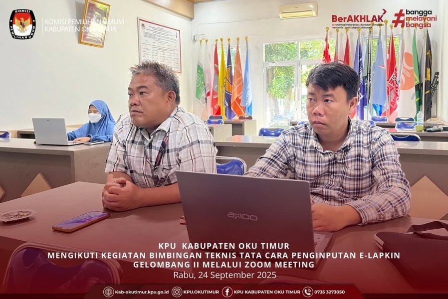 #TemanPemilih Kasubbag Perencanaan, Data dan Informasi KPU Kabupaten OKU Timur Bapak Didi Suryadi, staf dan operator mengikuti Bimbingan Teknis tata cara penginputan E-Lapkin gelombang II melalui Zoom Meeting. Rabu (24/09/2025)