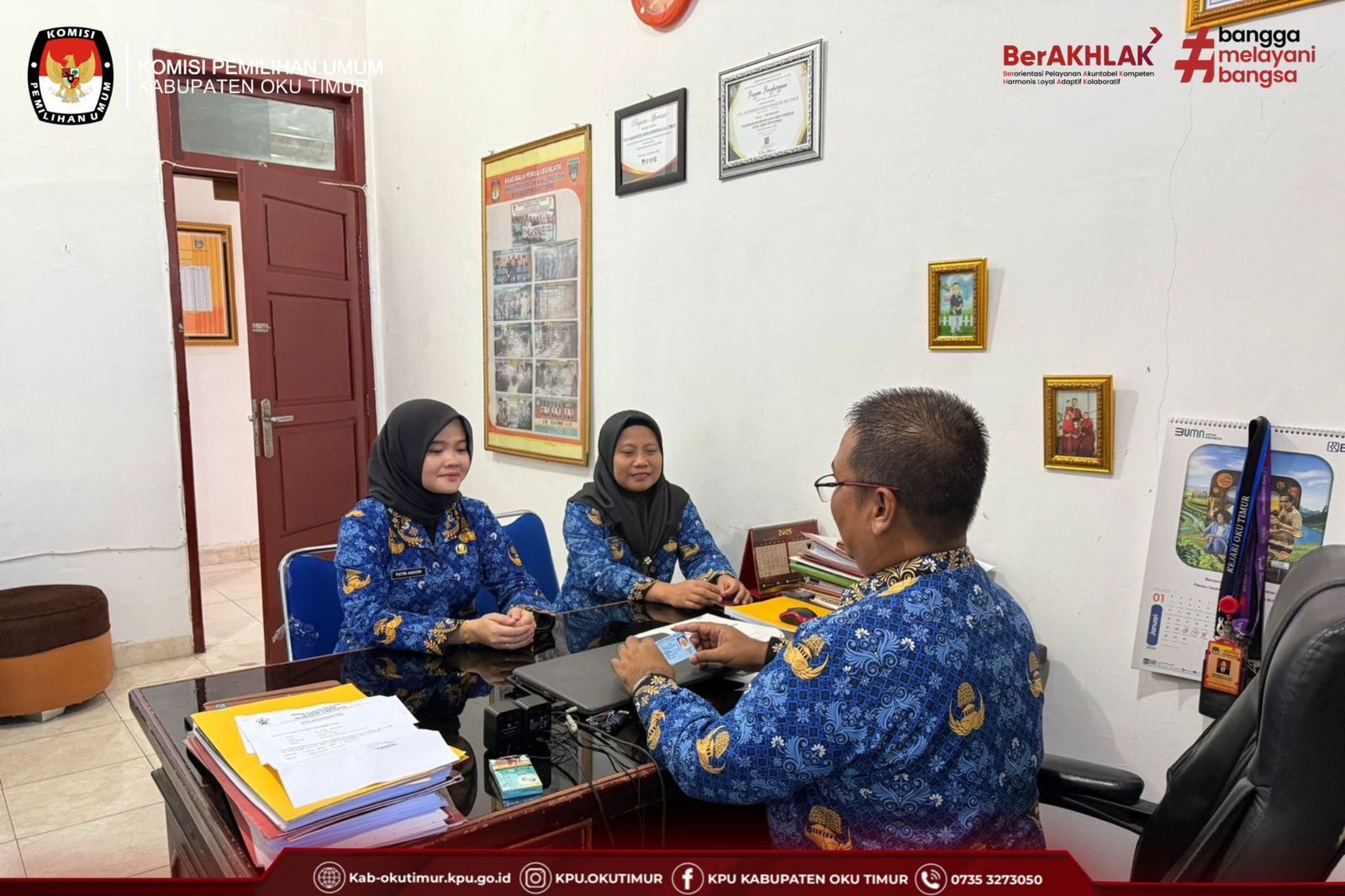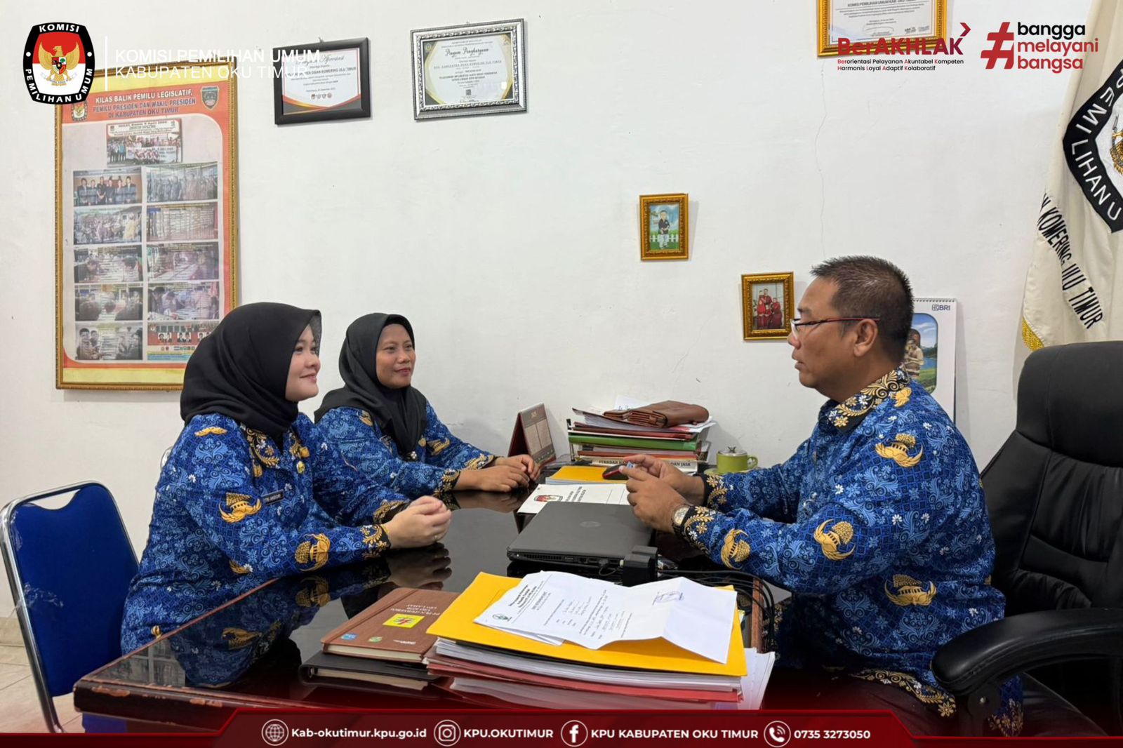 Sekretaris KPU Kabupaten OKU Timur Bapak Irto Sunardi, S.E., M.Si didampingi Kasubbag Parmas dan SDM Ibu Anita Papera. S.E menerima 1 (satu) orang PPPK di Lingkungan Sekretariat KPU Kabupaten OKU Timur untuk melapor dan melaksanakan tugas mulai tanggal 1 Oktober 2025.