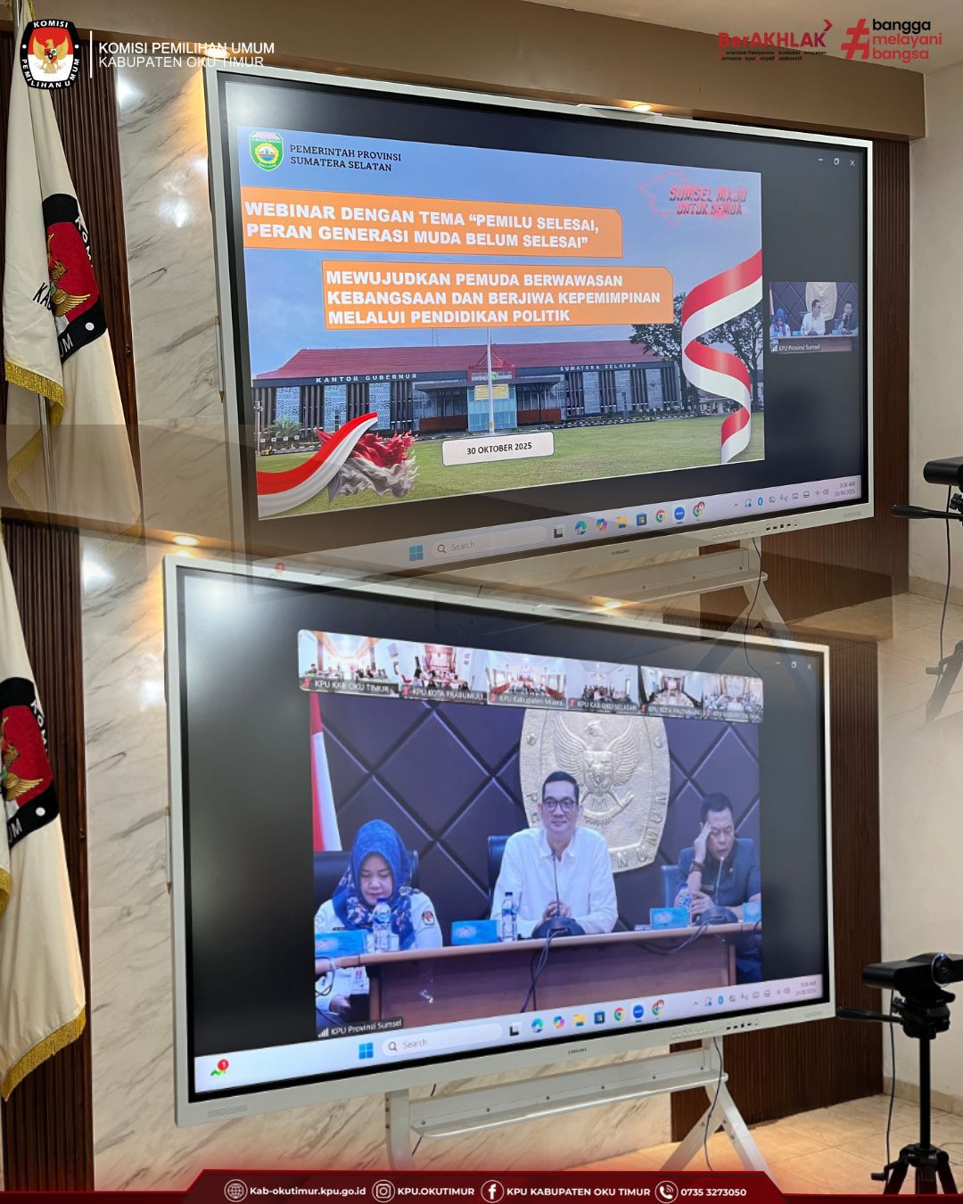 #TemanPemilih KPU Kabupaten OKU Timur mengikuti Webinar Sosialisasi Pendidikan Pemilih yang diselenggarakan oleh KPU Provinsi Sumatera Selatan dengan Tema “Pemilu Selesai, Peran Generasi Muda belum Usai”. Kamis (30/10/2025)