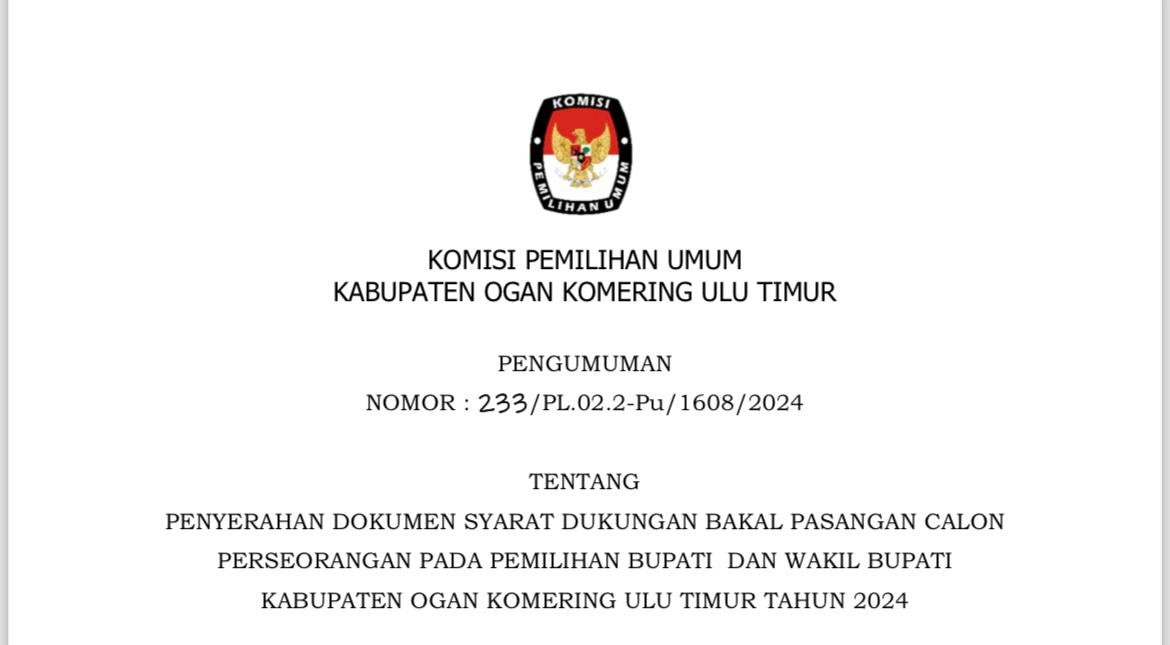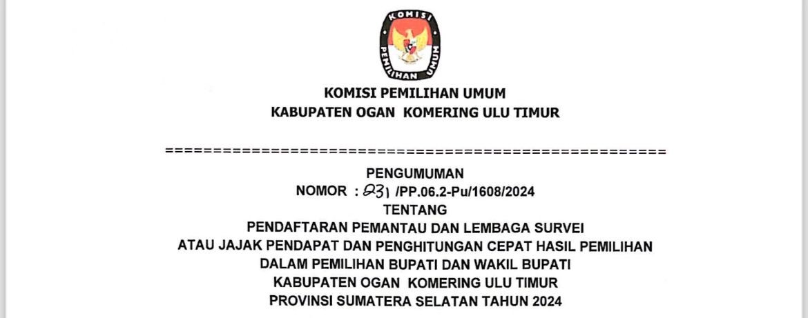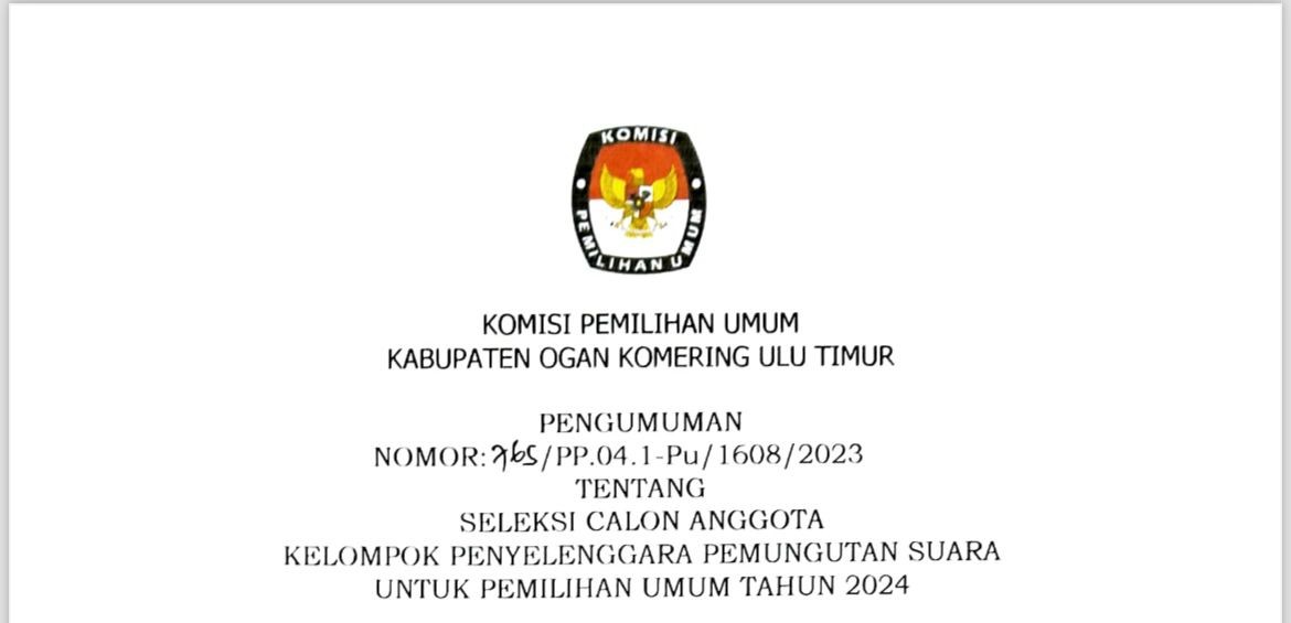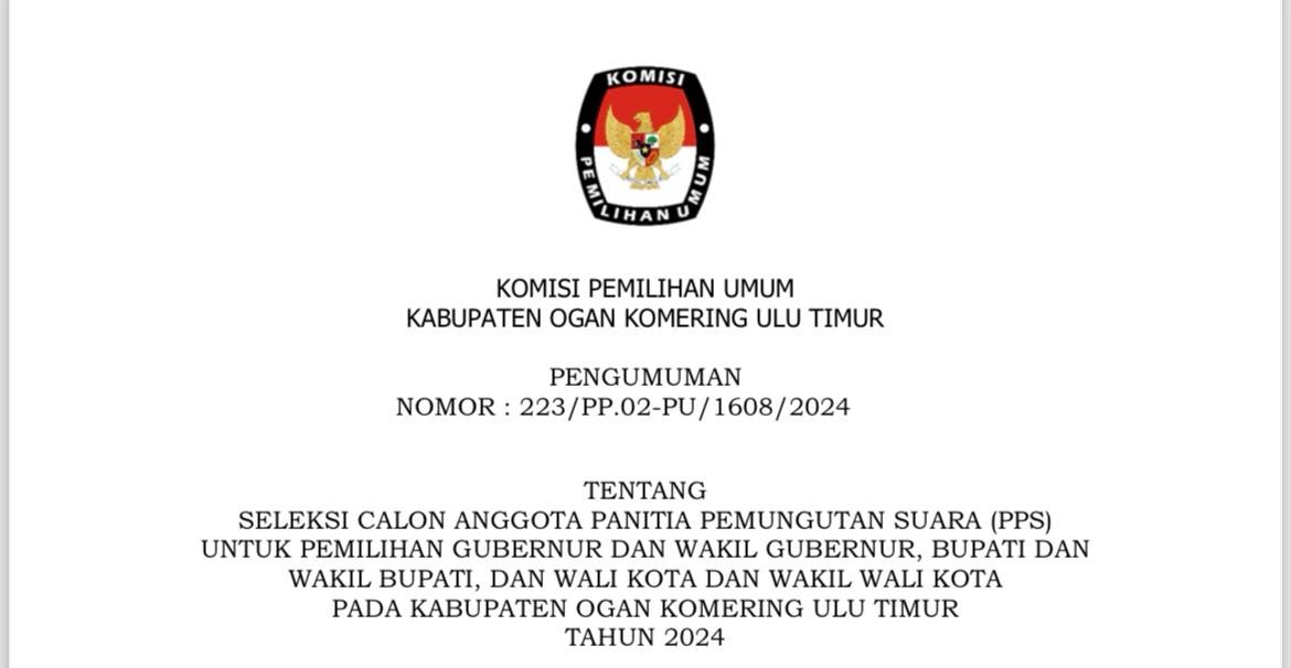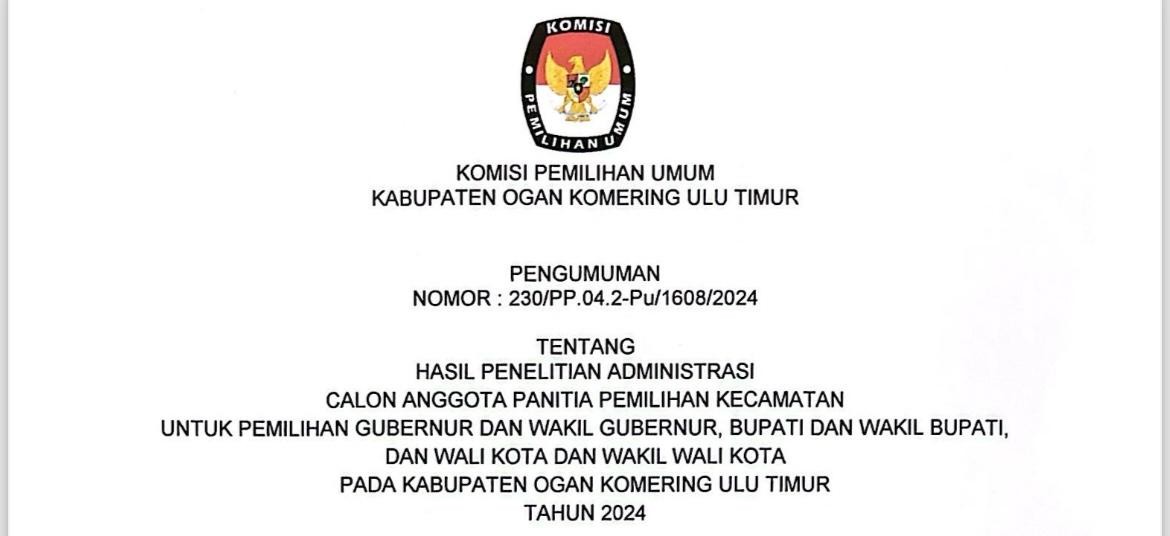 #TemanPemilih, Berikut Pengumuman Nomor : 230/PP.04-2-Pu/1608/2024 Tentang Hasil Administrasi Calon Anggota Panitia Pemilihan Kecamatan Untuk Pemilihan Gubernur dan Wakil Gubernur, Bupati dan Wakil Bupati, dan Wali Kota dan Wakil Wali Kota Pada Kabupaten Ogan Komering Ulu Timur Tahun 2024, File Lengkap Dapat di unduh DISINI