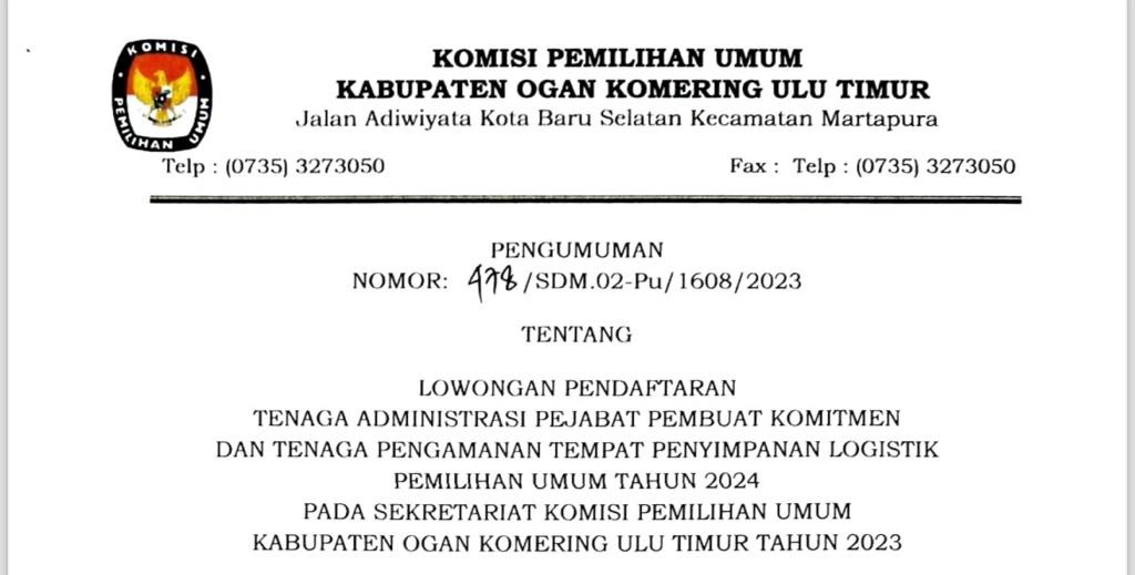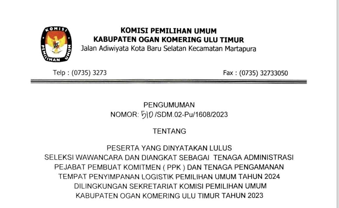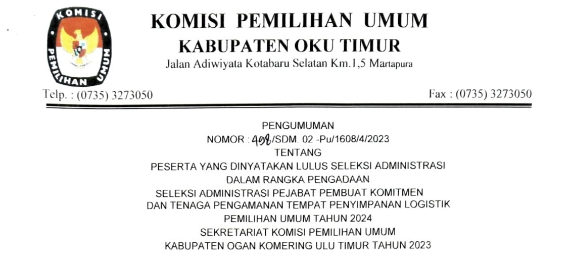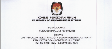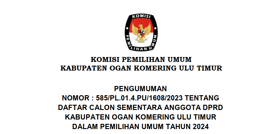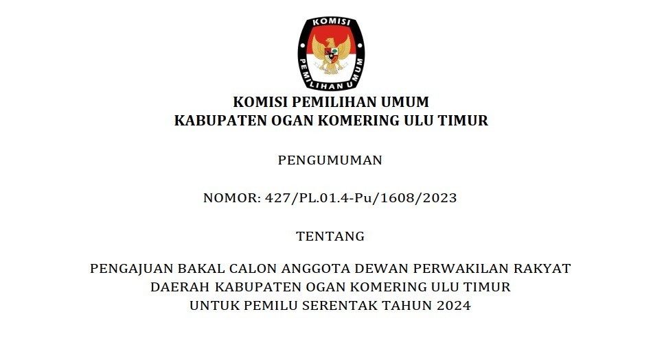 Bahwa untuk melaksanakan ketentuan Pasal 85 ayat (1) Peraturan KPU Nomor 10 Tahun 2023 tentang Pencalonan Anggota Dewan Perwakilan Rakyat, Dewan Perwakilan Rakyat Daerah Provinsi, dan Dewan Perwakilan Rakyat Daerah Kabupaten/Kota dan berdasarkan Keputusan Komisi Pemilihan Umum Kabupaten Ogan Komering Ulu Timur Tahun 2023 tentang Daftar Calon Tetap Anggota Dewan Perwakilan Rakyat Kabupaten Ogan Komering Ulu Timur Dalam Pemilihan Umum Tahun 2024 tanggal 3 Oktober 2023, Komisi Pemilihan Umum mengumumkan Daftar Calon Tetap (DCT) Anggota Dewan Perwakilan Rakyat Daerah Kabupaten Ogan Komering Ulu Timur dan persentase keterwakilan perempuan dalam DCT sebagaimana terlampir. Data lengkap calon tetap Anggota DPRD Ogan Komering Ulu Timur dapat dilihat melalui portal publikasi https://infopemilu.kpu.go.id/Pemilu. Demikian diumumkan untuk diketahui. Selengkapnya dapat diunduh pada link dibawah ini PENGUMUMAN DCT LAMPIRAN PENGUMUMAN SALINAN SK PENETAPAN DCT
