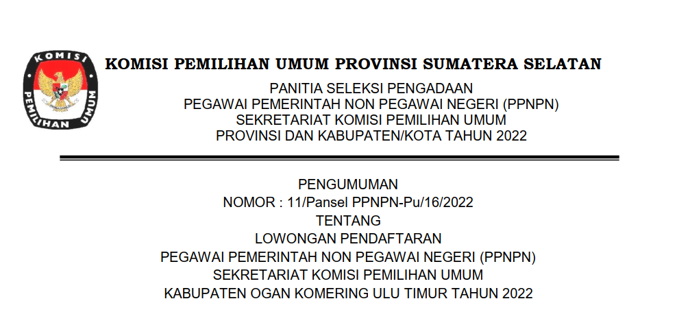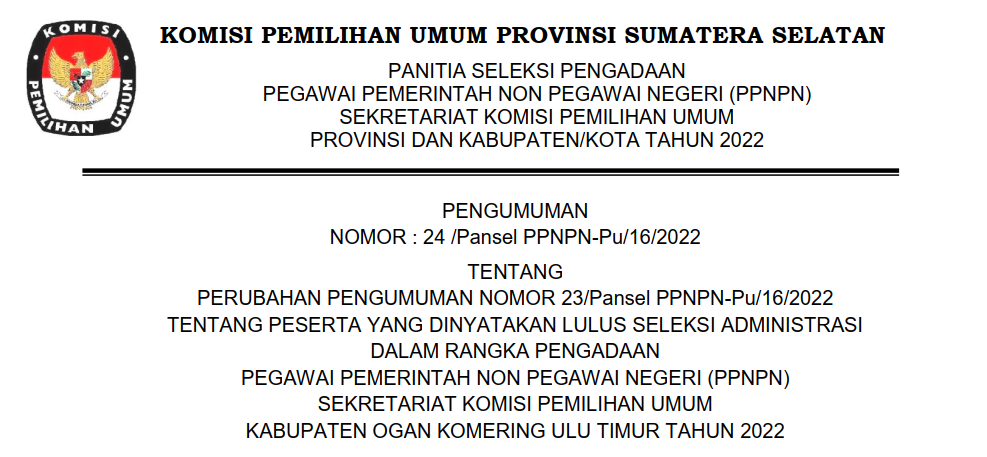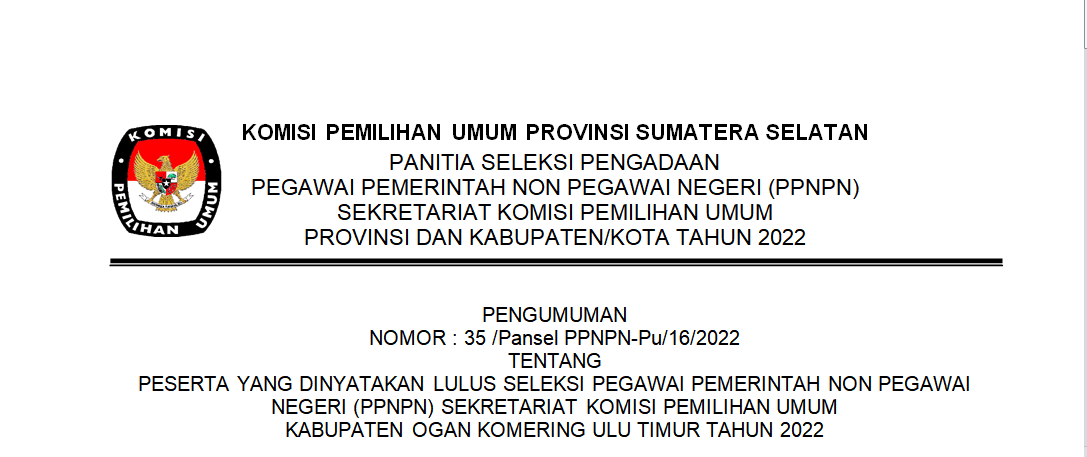 Berikut kami sampaikan pengumuman akhir penerimaan Pegawai Pemerintah Non Pegawai Negeri (PPNPN) Sekretariat KPU Kabupaten OKU Timur yamg dapat diunduh disini. PENGUMUMAN KELULUSAN PPNPN