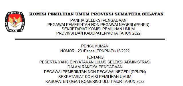 Berikut Kami Sampaikan Hasil Seleksi Administrasi Pegawai Pemerintah Non Pegawai Negeri (PPNPN) Sekretariat KPU Kabupaten OKU Timur, yang dapat diunduh disini.PENGUMUMAN SELEKSI ADMINISTRASI PPNPN KPU OKUT.PDF