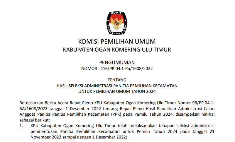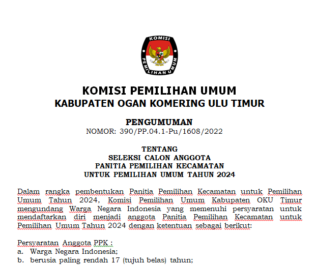 BERIKUT MERUPAKAN PENGUMUMAN NOMOR: 390/PP.04.1-Pu/1608/2022 TENTANG SELEKSI CALON ANGGOTA PANITIA PEMILIHAN KECAMATAN UNTUK PEMILIHAN UMUM TAHUN 2024 YANG DAPAT DIUNDUH DISINIPENGUMUMAN PPK PEMILU 2024 OKU TIMUR