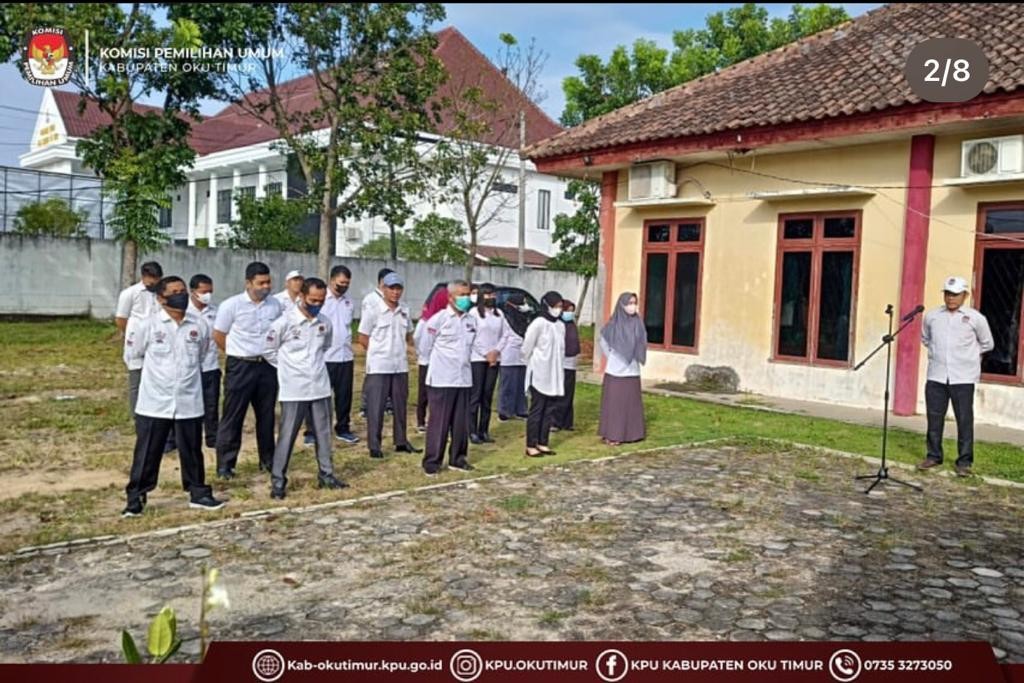 #temanpemilih, KPU Kabupaten Ogan Komering Ulu Timur Melaksanakan Apel Pagi rutin setiap hari senin. Apel di pimpin oleh Sekertaris KPU Bapak Irto Sunardi, SE.,M.Si. dan diikuti oleh Kasubag, dan Staf KPU OKU Timur. Dalam kesempatan ini juga dilakukan penyerahan SK PPNPN.