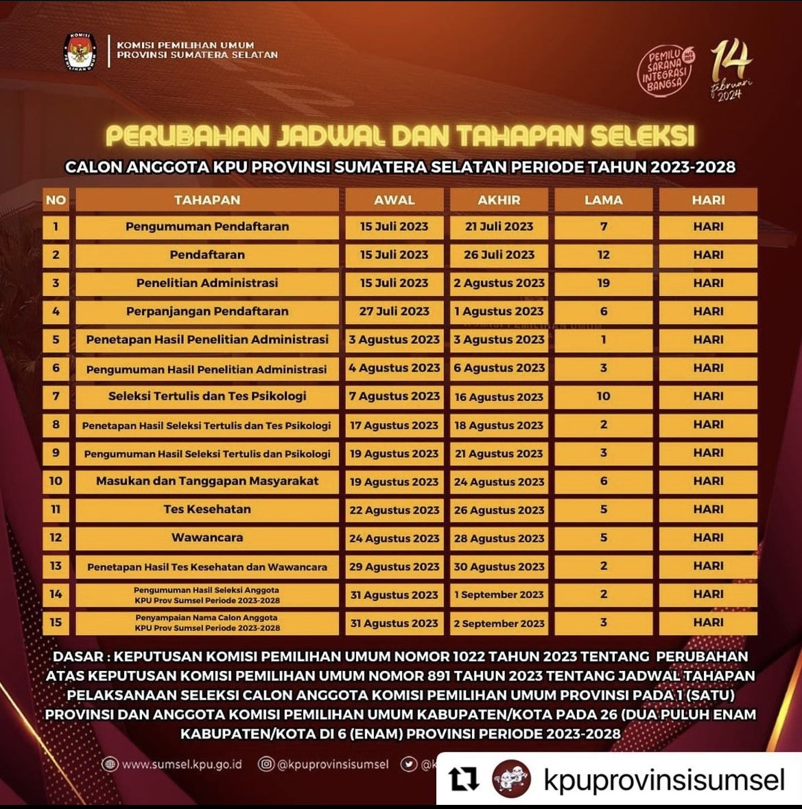 #Temanpemilih yuk simak, berikut perubahan jadwal seleksi dan tahapan seleksi Bakal Calon Anggota KPU Sumsel Periode Tahun 2023-2028 berdasarkan Keputusan KPU Nomor 1022 Tahun 2023.